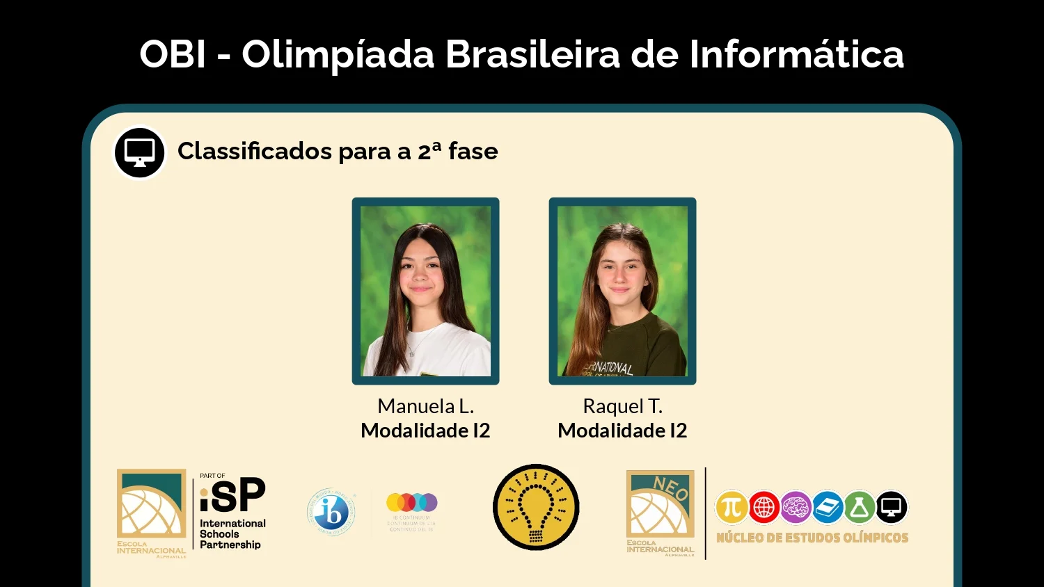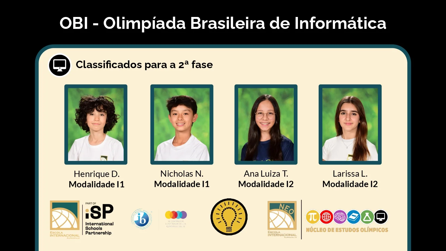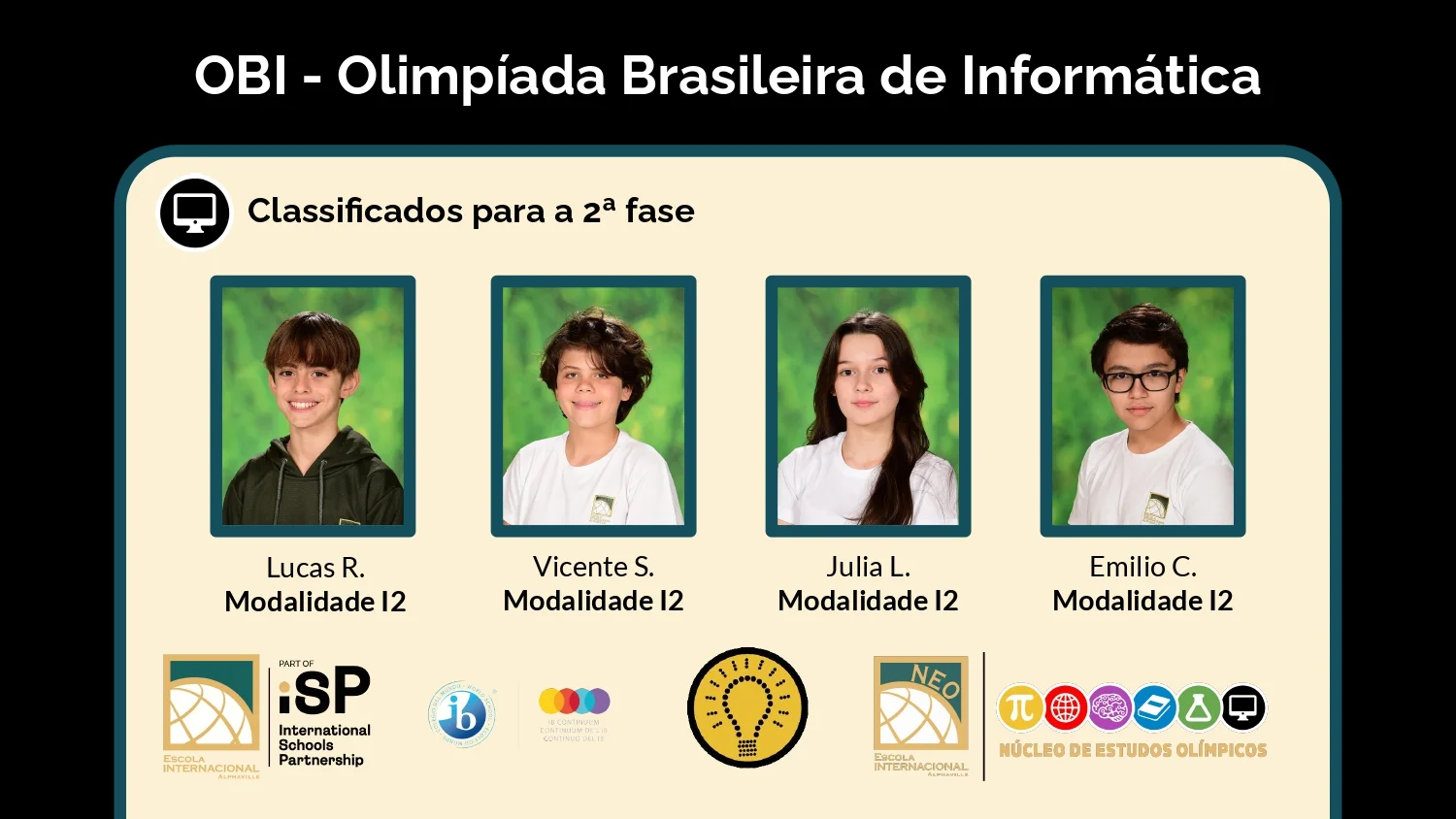 Temos o prazer de anunciar que 18 alunos foram selecionados para a 2ª fase da Olimpíada Brasileira de Informática (OBI), organizada pela Sociedade Brasileira de Computação (SBC) em parceria com a Universidade Estadual de Campinas (UNICAMP).Nesta nova etapa, os nossos alunos representarão a escola entre os concorrentes do estado de São Paulo. Se se destacarem, passarão para a fase nacional da competição.Parabenizamos todos os alunos selecionados por esta conquista e desejamos-lhes boa sorte e sucesso nas próximas etapas da competição.