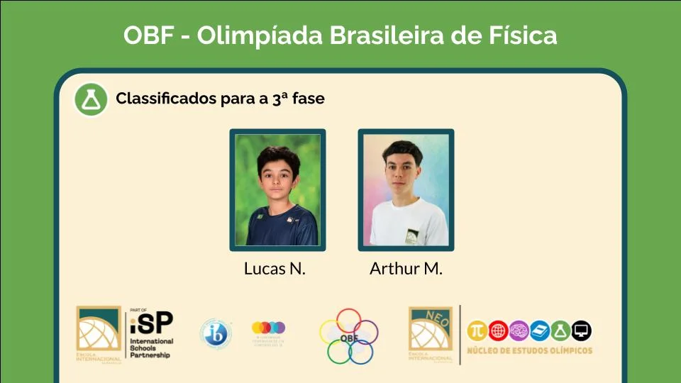 Após os desafios enfrentados em junho e agosto, temos o prazer de anunciar que dois alunos da Escola Internacional de Alphaville se classificaram para a 3ª fase da Olimpíada Brasileira de Física (OBF).Em outubro, Lucas N. e Arthur M. representarão a nossa escola na fase final desta prestigiosa competição, que inclui duas etapas: teórica e experimental.Parabenizamos os nossos alunos por esta conquista notável e desejamos-lhes muito sucesso em sua jornada!