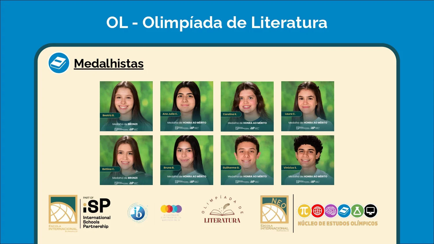 Após semanas de intensa preparação focada em Memórias Póstumas de Brás Cubas, de Machado de Assis, os nossos alunos do 1º ao 3º ano do Ensino Médio abraçaram o desafio da 10ª edição da Olimpíada de Literatura (OL).Temos o orgulho de parabenizar os oito alunos que receberam reconhecimento nacional, conquistando medalhas de bronze e menções honrosas!Medalhistas de bronze: Beatriz (H2) e Bettina (H3)Menções honrosas: Ana Julia (H2), Bruna (H2), Guilherme (H3), Laura (H3), Vinicius (H3) e Carolina (H3)