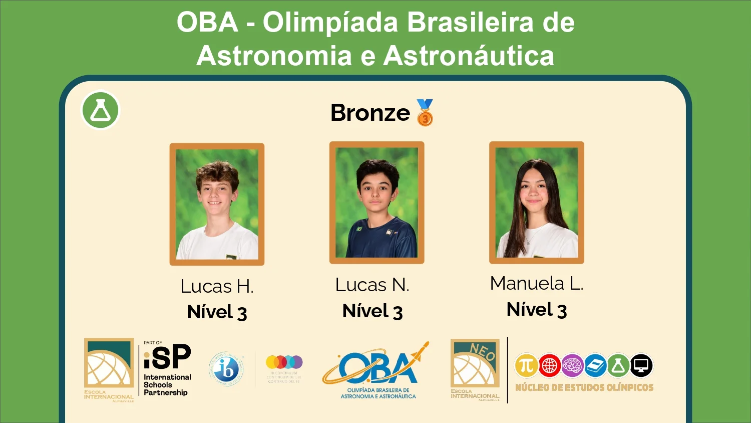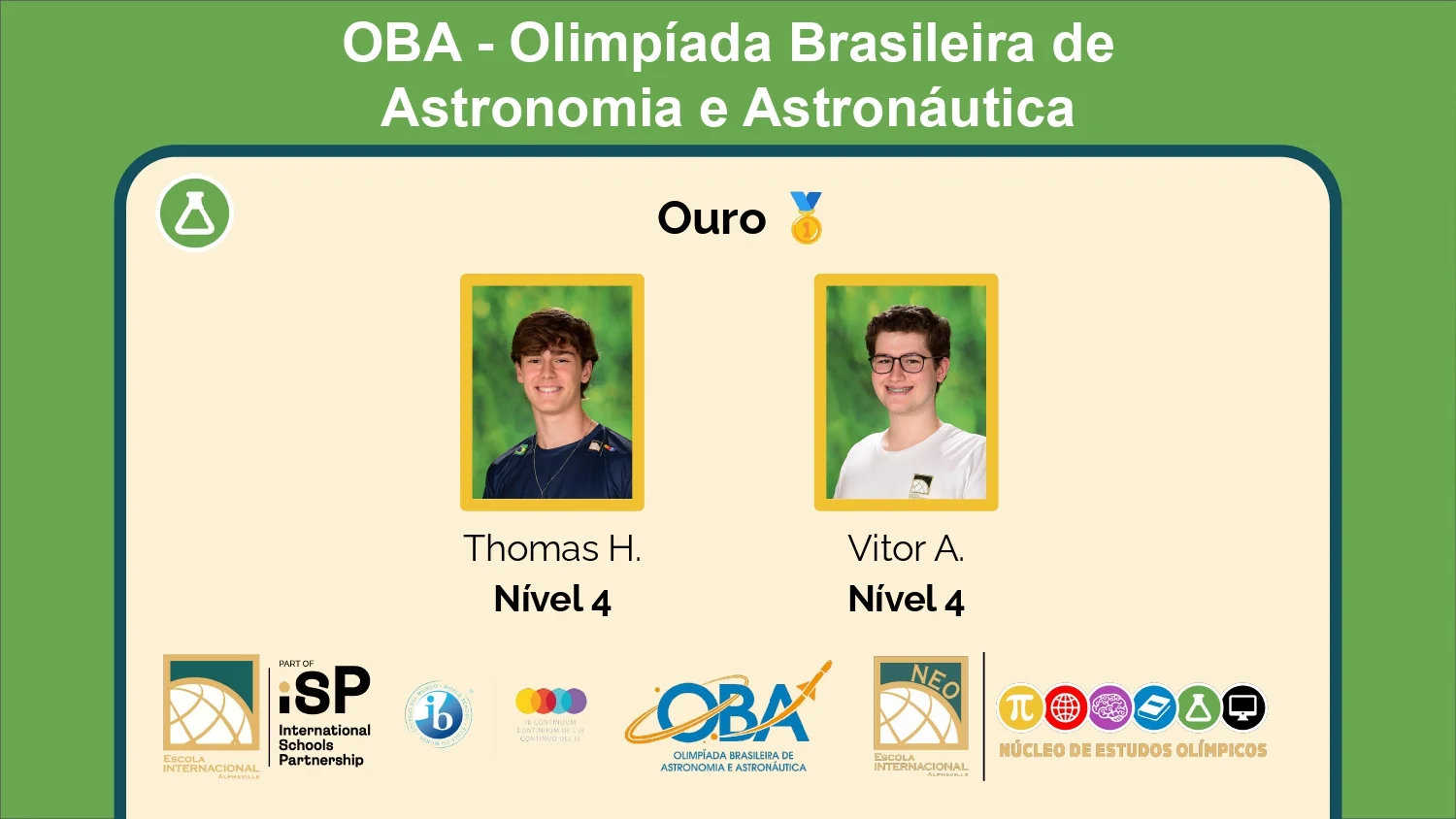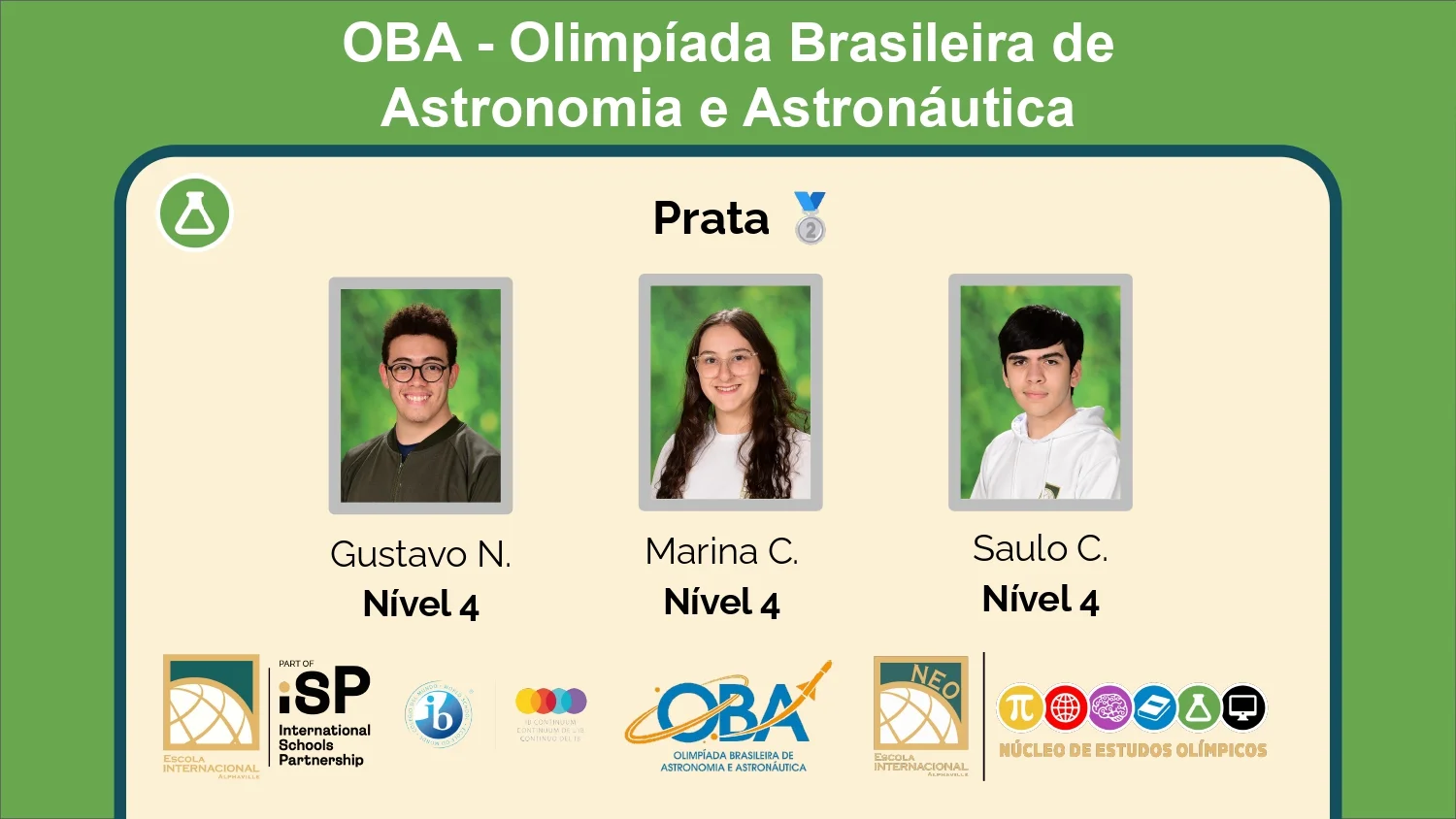 Com grande alegria, comemoramos a conquista de 21 medalhas na Olimpíada Brasileira de Astronomia e Astronáutica (OBA)!Entre os meses de março e maio, os nossos alunos demonstraram dedicação e entusiasmo ao se prepararem para a competição, enfrentando desafios envolvendo conceitos fundamentais de Astronomia e Astronáutica.