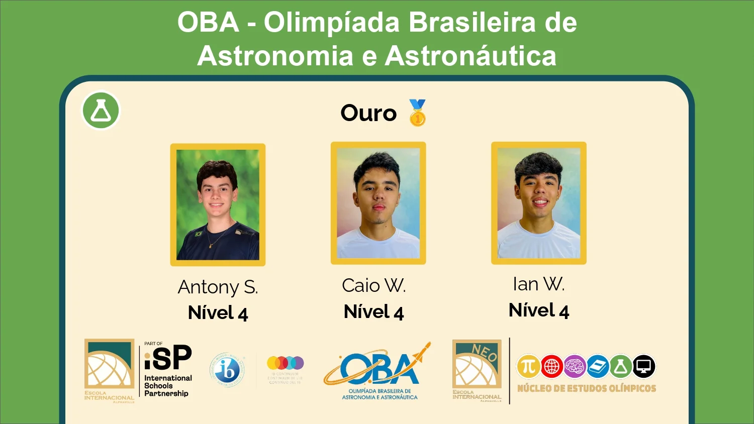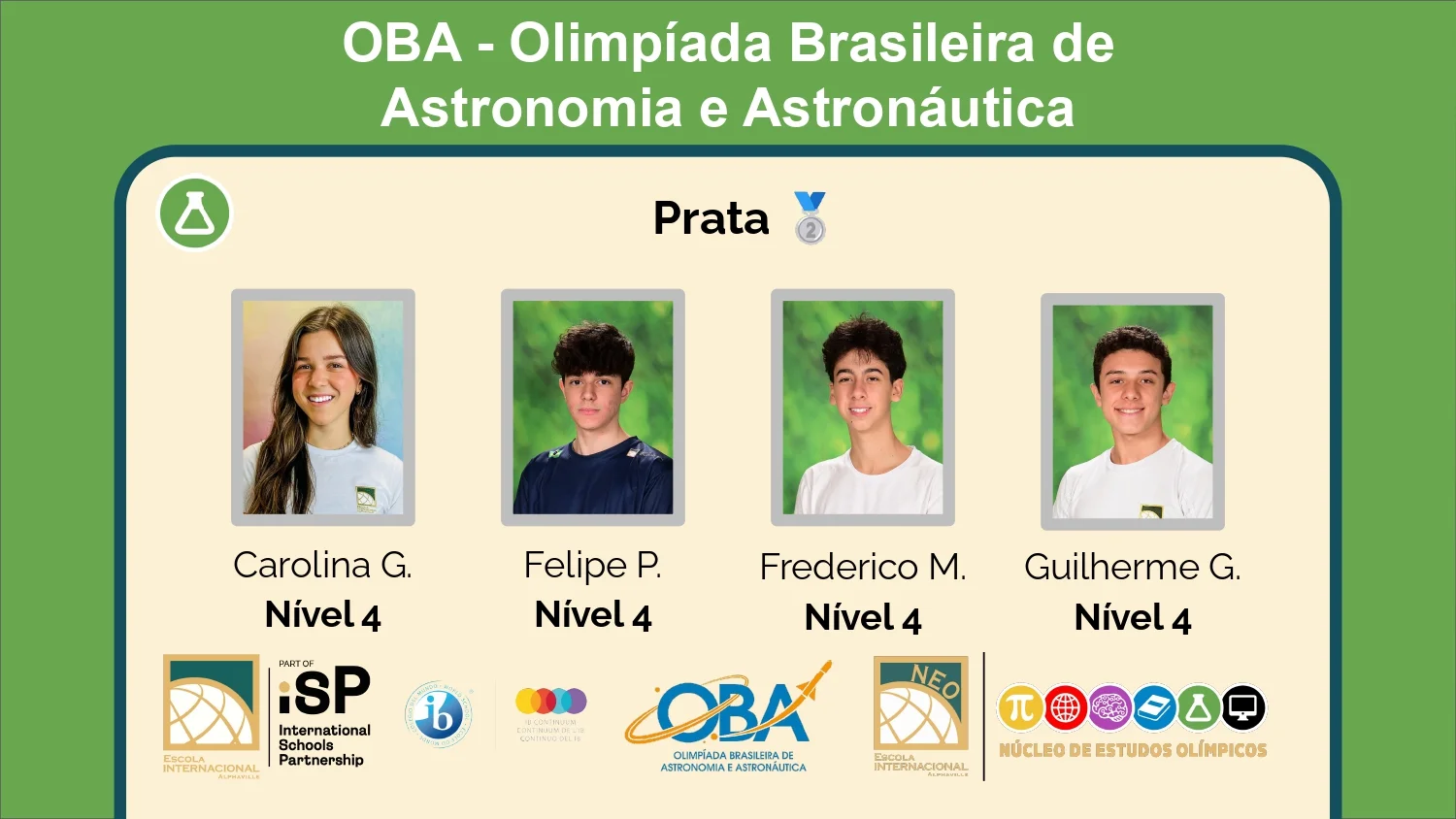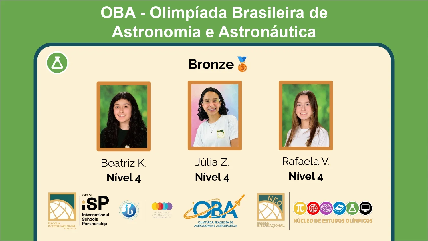 Com grande alegria, comemoramos a conquista de 21 medalhas na Olimpíada Brasileira de Astronomia e Astronáutica (OBA)!Entre os meses de março e maio, os nossos alunos demonstraram dedicação e entusiasmo ao se prepararem para a competição, enfrentando desafios envolvendo conceitos fundamentais de Astronomia e Astronáutica.