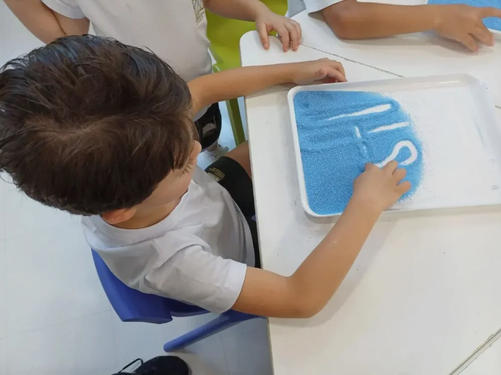 Através dessa exploração, eles começam a prestar atenção aos movimentos envolvidos na formação das letras e, gradualmente, desenvolvem habilidades motoras finas. Dessa forma, nossos pequenos ganham confiança e começam a escrever letras de forma mais independente. Para complementar esse trabalho, usamos músicas, jogos e histórias, fortalecendo ainda mais a conexão entre a fala e a escrita. Com incentivo positivo e um ambiente estimulante, todas as crianças progridem à medida que dão seus primeiros passos na jornada rumo à alfabetização.
